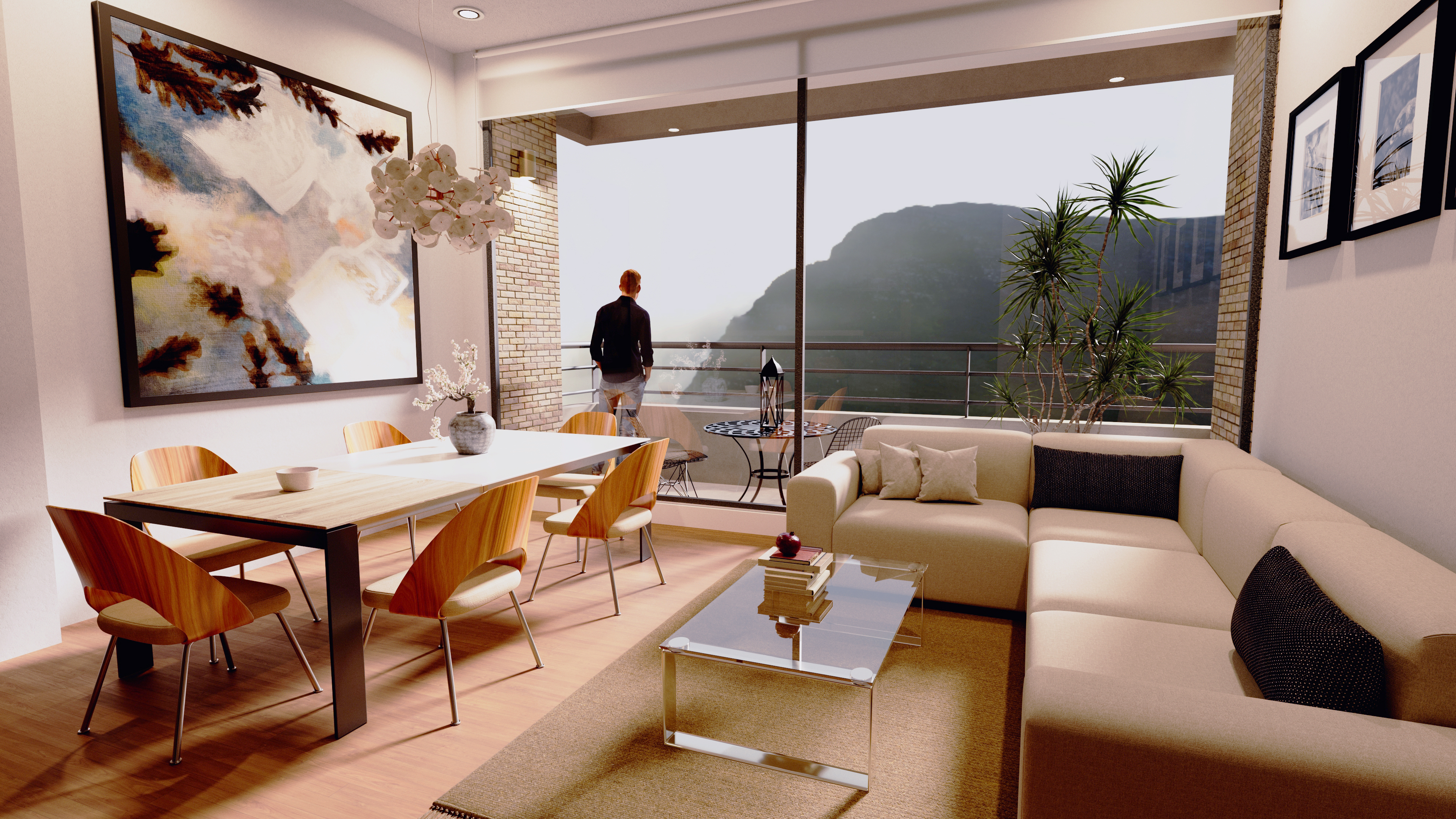 Ejemplo de una visualización arquitectónica: Cómo tal se intenta recrear en su totalidad la experiencia de estar en la sala de uno de los apartamentos que se busca vender, este se decora con mobiliario moderno que esté bien ubicado en relación a la cámara y se recrea un tiempo del día que le genere placer al cliente.