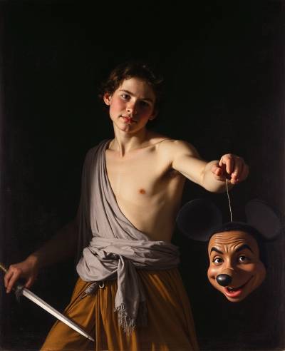 Decidí tomar la obra de arte David con la cabeza de Goliat, le dije a la IA openart lo siguiente: Quiero que recrees la obra David con la cabeza de Goliat de Caravaggio con los cuerpos de mickey mouse y minnie mouse está fue su interpretación.