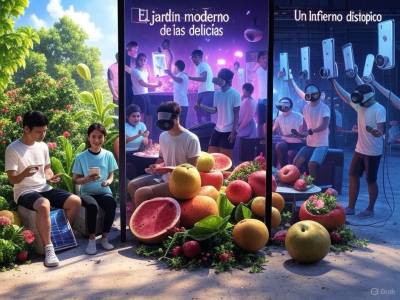 ### Panel derecho: Un infierno distópico El panel derecho se sumerge en una visión de pesadilla de la condenación moderna, reinterpretando el infierno de Bosch como un páramo industrial distópico. Un complejo industrial masivo domina la escena, sus chimeneas arrojan nubes oscuras que ahogan el paisaje orgánico y retorcido de abajo. Figuras con máscaras de gas trabajan sin cesar en medio de maquinaria oxidada, sus formas sin rostro evocan la deshumanización del colapso ambiental y la industrialización. En primer plano, los adictos a las redes sociales se retuercen de tormento, aplastados bajo el peso de teléfonos inteligentes colosales, con pantallas rotas y brillando débilmente, que simbolizan el dominio destructivo de la adicción a la tecnología. Dispersas por el suelo, las consolas de DJ rotas chisporrotean y arden, sus cables enredados son un testimonio del colapso del exceso hedonista. Los detalles surrealistas profundizan el horror: las figuras están atrapadas en interminables rollos de feeds digitales, con los ojos hundidos; otras son consumidas por llamas de desinformación que surgen de pantallas destrozadas. La paleta es oscura (grises, negros y amarillos enfermizos) acentuada por destellos de neón, manteniendo la complejidad caótica de Bosch al tiempo que refleja las ansiedades de la sociedad contemporánea.