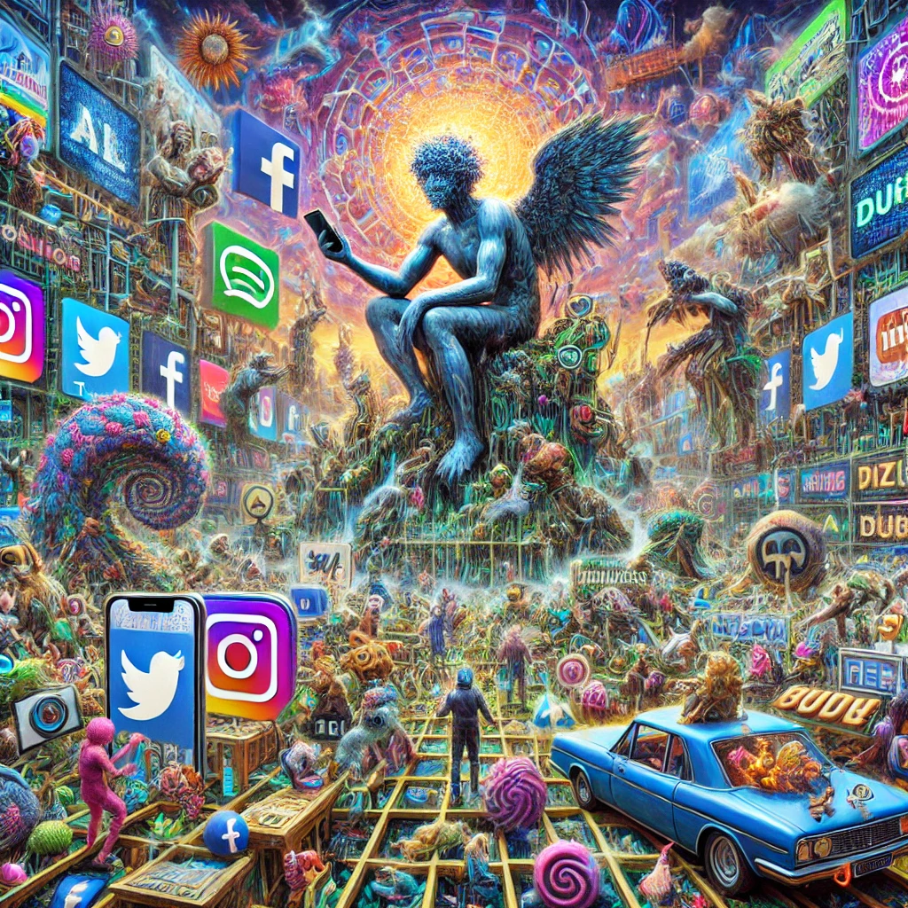 Esta pieza me llama mucho la atención debido a las técnicas empleadas para su creación, así como los elementos que la componen. Para su rediseño pensé en algo que plasmara el avance de las tecnologías y sus impactos en la actualidad, de ahí que para su creación, en ChatGPT añadiera el prompt: Crea una ilustración caótica con referencias a la era digital, redes sociales, el metaverso y el consumismo descontrolado basada en “El Jardín de las Delicias” de El Bosco.