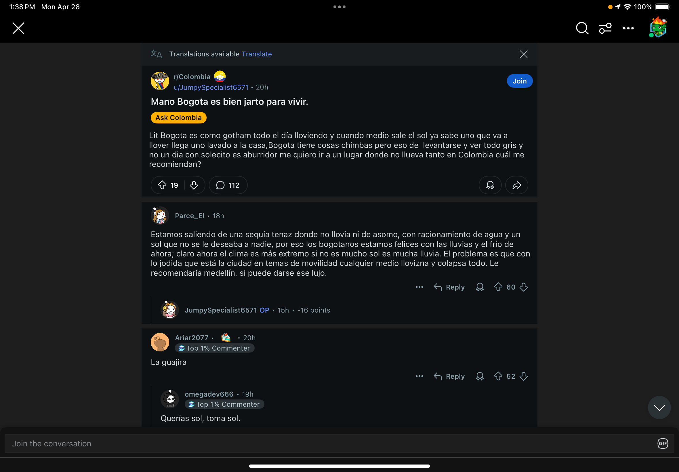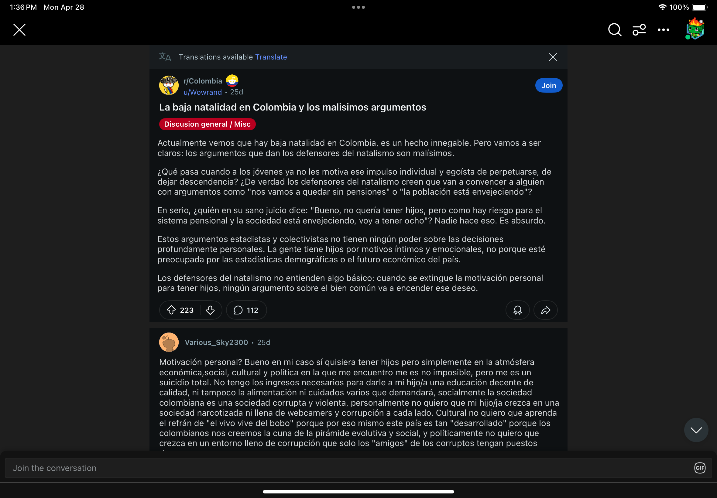 Mi algoritmo de Reddit tiene dos versiones, la página que es posts populares y la página que es sobre comunidades que yo sigo. El primero que tiene que ver con la página que le llama la aplicación “popular” o cómo mejor se entiende: Trending. La aplicación es bastante clara en la forma cómo muestra las publicaciones, la más obvia es basada en contexto desde donde se entra a la aplicación, siendo comunidades que sean centradas en Colombia, Bogotá o Medellín, comunidades que uno entendería que publican contenido interesante sobre estos lugares, pero en realidad es una comunidad que ve este foro cómo método de desahogo y chisme, en donde lo más común es publicaciones de temáticas de infidelidades, cuánto gana la gente en Colombia, consejos de inversión y propaganda política. Segundo el algoritmo de todo Reddit se basa en la frase: “porque viste X comunidad, te mostramos esto”. Entonces uno está consumiendo contenido basado en lo que yo busco, más que lo que me quiere mostrar la red social.